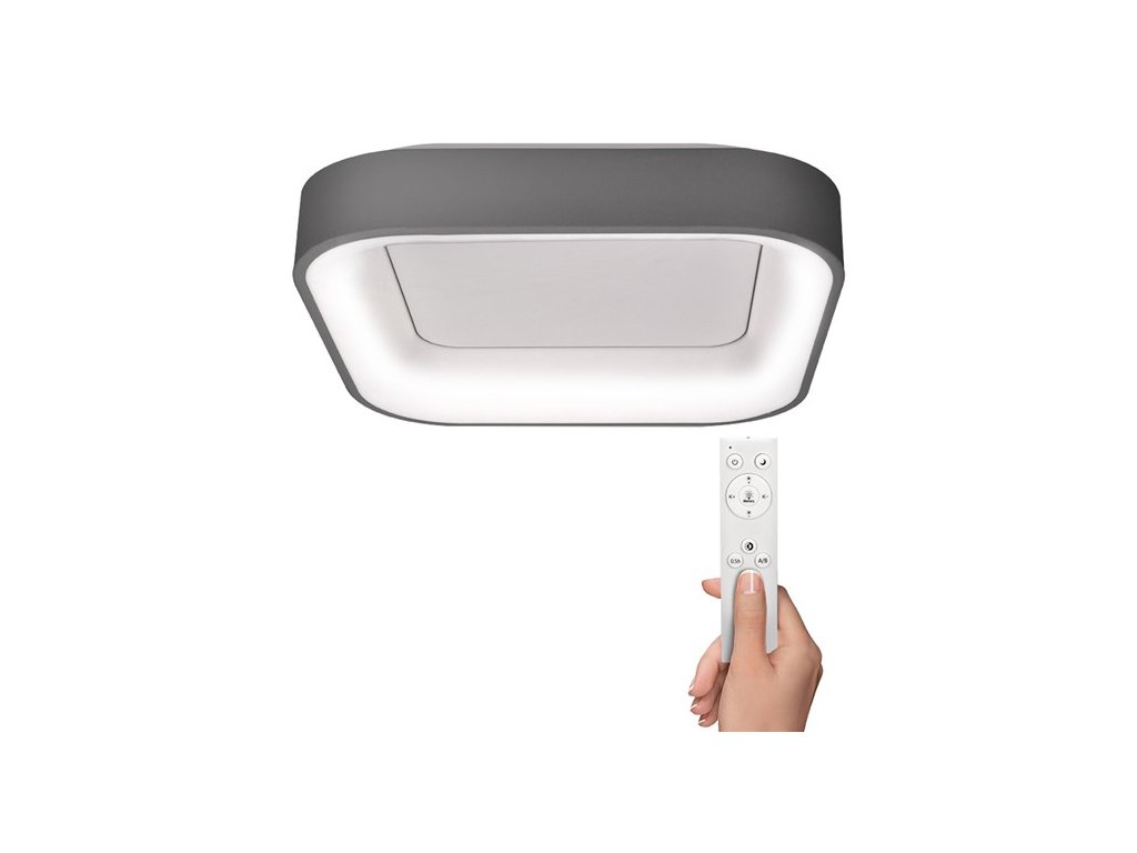 Svietidlo stropné SOLIGHT TREVISO WO769-G 48W LED stmievateľné osvetlenie s diaľkovým ovládaním a možnosťou zmeny chromatickosti (teploty svetla) diaľkovým ovládačom možno svetlo plynulo stmievať, meniť teplotu svetla či voliť medzi prednastavenými módy svietenia. Jedným ovládačom je možné ovládať viac svetiel naraz. Pre inštaláciu na steny a stropy. Technické parametre: - spotreba: max. 48W - svetelný tok: max. 2880lm - teplota chromatickosti: 3000K - 6500K - diaľkový ovládač súčasťou (2xAAA batérie nie sú súčasťou) - životnosť LED: 20.000 hodín - uhol svietenia: 120 ° - index podania farieb Ra:> 80 - materiál: Fe + PS - krytie: IP20 - napätie: 220-240V AC - energetická trieda: A + - prevádzková teplota: -20 ° C až 50 ° C - tvar: štvorcový - farba: šedá - rozmery: 450 x 450 x 100mm