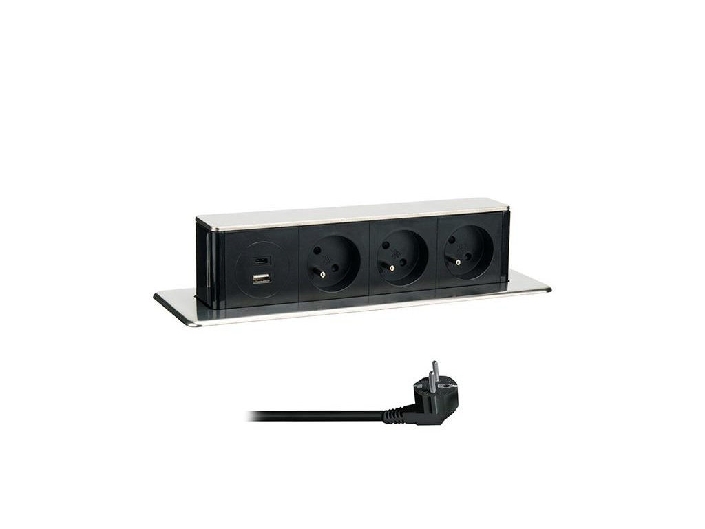 Výsuvný blok so zásuvkami je praktickým doplnkom pre pracovné dosky a stoly, ktorý umožňuje ľahký prístup k elektrickým prípojkám iba vtedy, keď je to potrebné. Vďaka tomu šetrí miesto a udržuje pracovnú plochu prehľadnú. Vrchný kryt z nerezovej ocele v striebornej farbe dodáva moderný vzhľad a zaisťuje odolnosť voči každodennému používaniu.