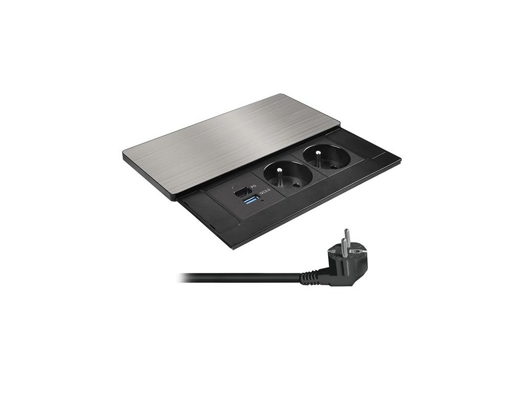 Vrchný kryt z matnej tmavej nerez ocele (inox) pôsobí elegantne a prirodzene zapadne do moderného interiéru. Nízky profil, čisté línie a nenápadné posuvné otváranie zachovávajú vzhľad pracovnej plochy. Zásuvky aj nabíjacie porty sú kedykoľvek ľahko prístupné jednoduchým pohybom ruky.