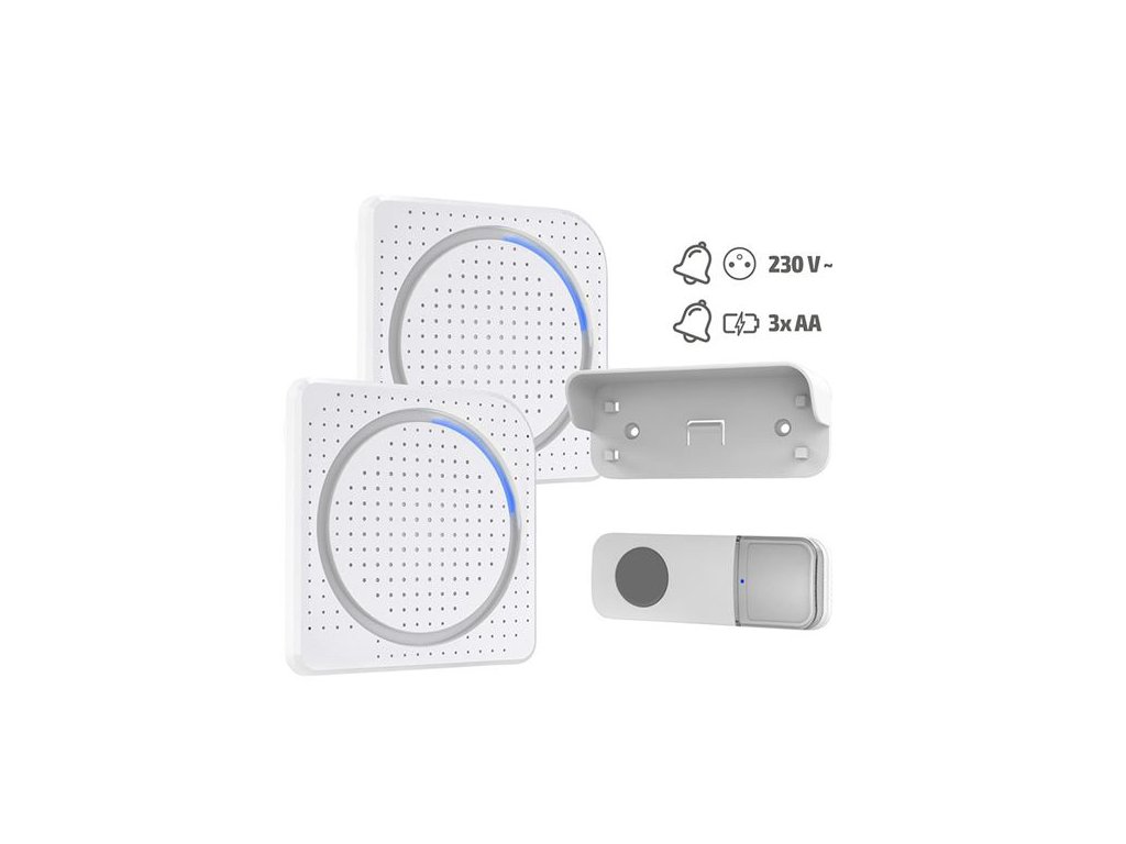 - jeden zvonček zapojený do zásuvky a druhý prenosný na batérie.