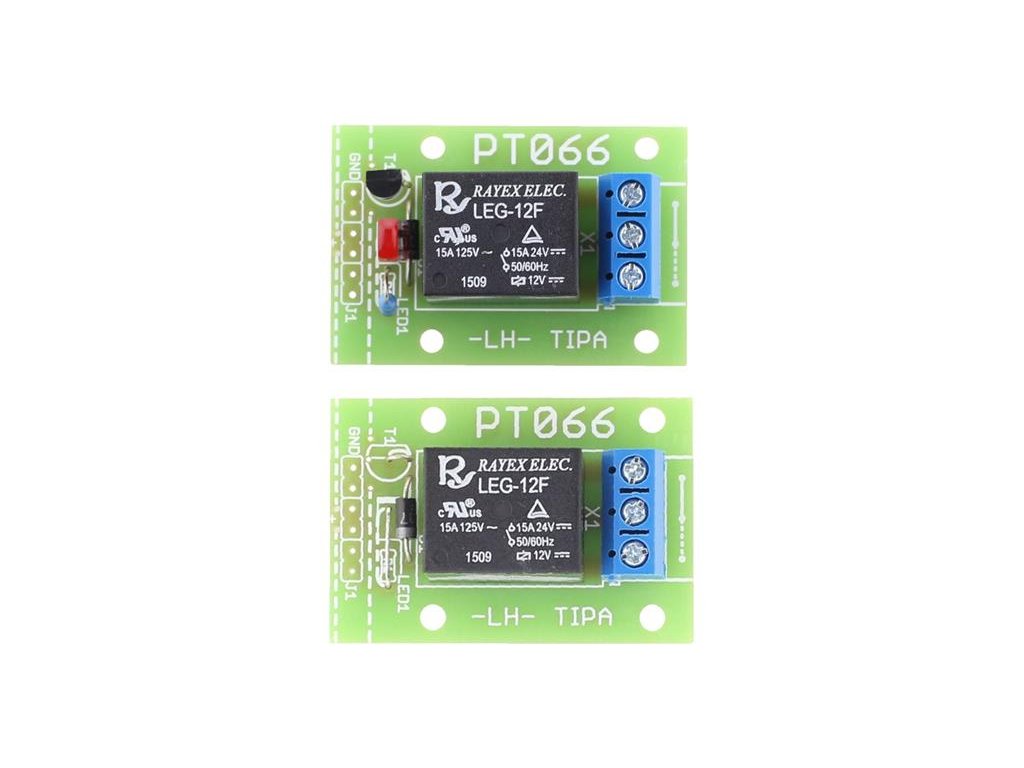 Stavebnice TIPA PT066A Relé deska se spínacím tranzistorem a LEDStavebnice PT066A, relé deska se spínacím tranzistorem a LED je určena zejména pro situace, kdy potřebujeme připojit výkonový spotřebič k řídící logice, která sama svým výkonem k ovládání spotřebiče nestačí. Takovým příkladem může být například připojení ke stavebnici PT067R – Infračervené dálkové ovládání (přijímač), kde lze s pomocí stavebnice PT066A posílit dálkově ovládané výstupy. Následně je tak možné ovládat například světla, garážová vrata, čerpadla, ventilátory apod.