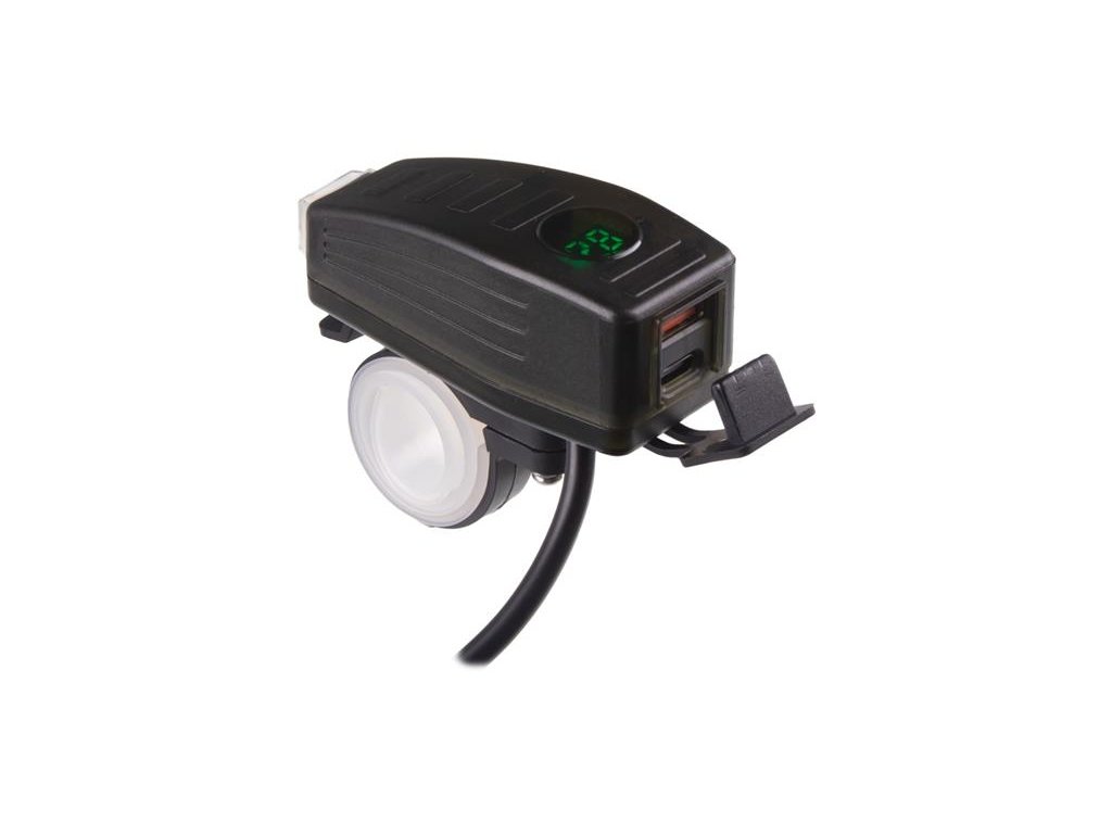USB/USB-C nabíjačka s voltmetrom na motocykel, vodeodolná krytka, vhodná napr. pre motocykle, štvorkolky a iné.