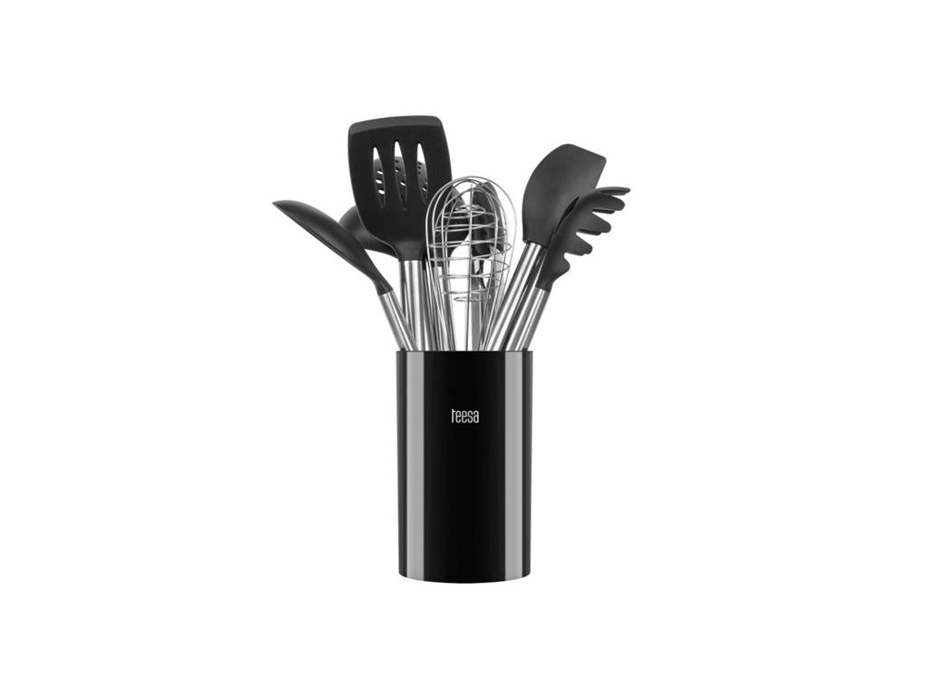Sada obsahuje všetko potrebné príslušenstvo, ktoré vám pomôže s prípravou každodenných jedál, napríklad naberačku, servírovaciu lyžicu a lyžičku na špagety, špachtľu a štrbinovú lyžicu, šľahaciu metlu a kliešte. Nádoba, ktorá je súčasťou sady, v kombinácii s eleganciou doplnkov spôsobí, že ich budete chcieť vystaviť miesto v zásuvke, aby ste ich mali vždy po ruke.