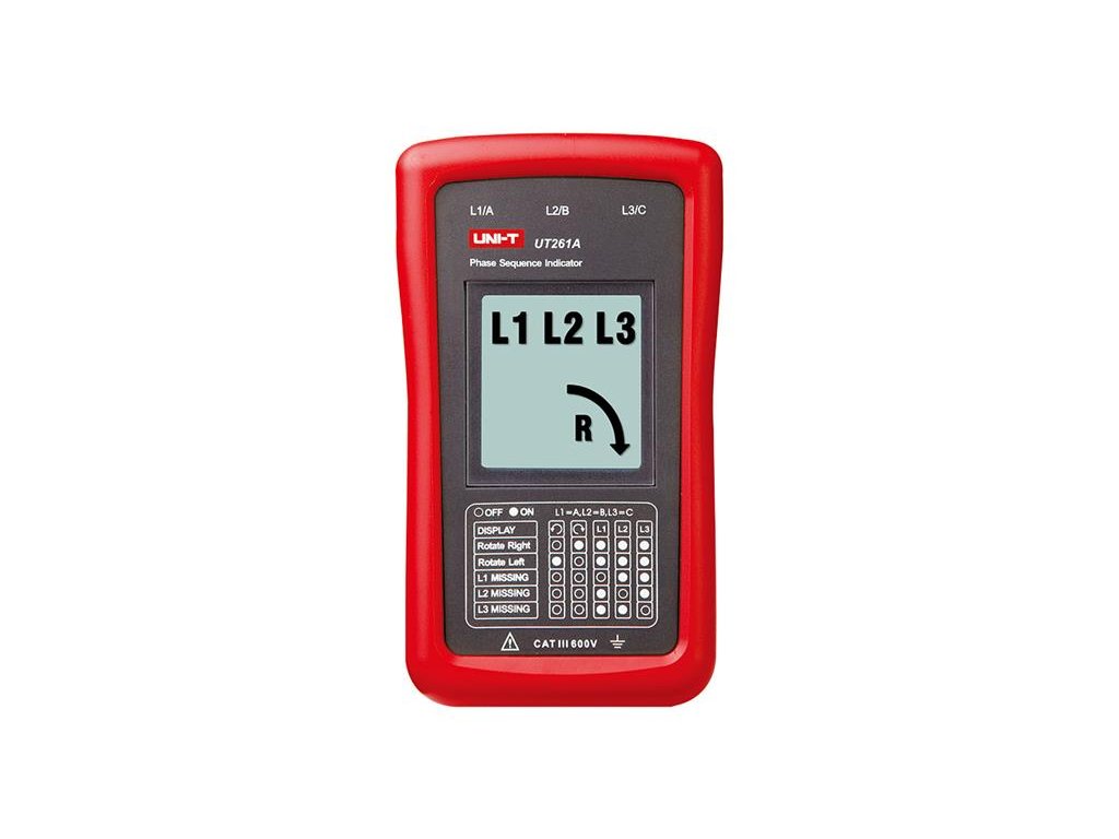 Tester rotácie fáz a indikátor otáčok motora UNI-T UT261ANa tento výrobok poskytujeme 3 roky záruku. Detektor sledu fáz UT261A slúži ku kontrole poradí zapojenia fázových vodičov do trojfázových motorov, kde je nutné dodržať smer otáčania. Po zapojení troch priložených meracích káblov do zdierok L1, L2, L3 na prístroji UT261A a druhým koncom s krokosvorkama na prívodné vodiče motora, sa nám na LCD displeji zobrazí smer rotácie osi motora po alebo proti smeru hodinových ručičiek.