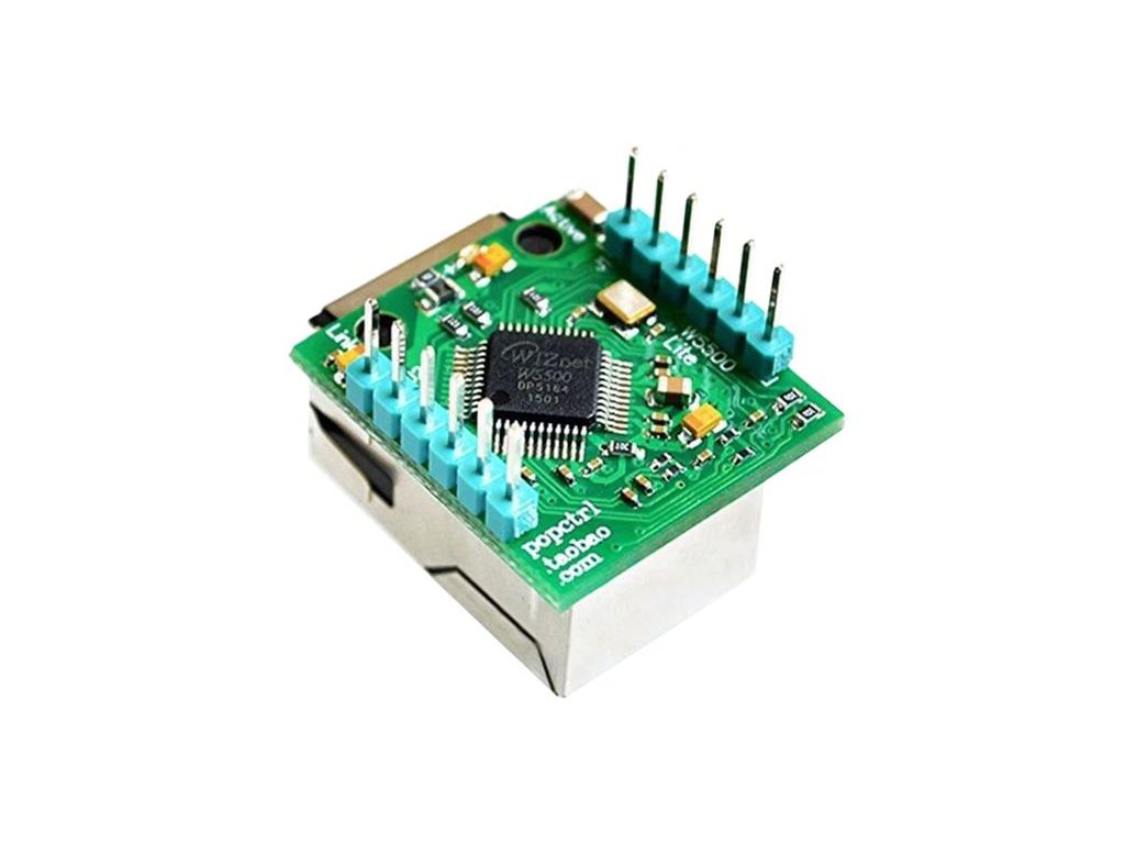 Miniatúrny modul s čipom WizNet W5500 pre pripojenie na Ethernetovú sieť pomocou Vášho Arduina. Ide prevádzkovo o veľmi spoľahlivý modul pre TCP komunikáciu. K riadiacemu kontroléru sa pripája pomocou rozhrania SPI (Serial Peripheral Interface), ktorý na spojenie vyžaduje päť signálov (clock-SCK, data in-MISO, data out-MOSI, chip select-CS a RESET). Ideálne pre Arduino DUE s podporou 3.3V technológie, k 5V signálom sú I/O tolerantné. Možnosť taktovania SPI až do 80MHz, prakticky funguje na DUE spoľahlivo aj pri 40MHz. RJ45 konektor s integrovanými pulznými transformátormi obsahuje aj dve LED pre signalizáciu pripojenia k sieti (zelená) a sieťovú aktivitu (žltá). Napájanie modulu je napätím 3.3V.