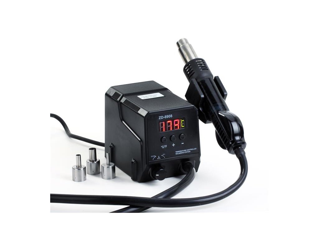 Teplovzdušná stanica ZD-8908Táto teplovzdušná vyfukávačka ZD-8908 má teplotný rozsah 100 ° C - 500 ° C. Vďaka tomu sa skvele hodí na zmršťovacie hadičky, k odpájkovaniu citlivých obvodov SMD ako SOIC, CHIP, PLCC, BGA a pod. Chráni obvody pred poškodením statickou elektrinou a prebíjaním elektrického prúdu. Uplatní sa ale aj v rade ďalších oblastí použitia, pri ktorých je dôležitý koncentrovaný tok horúceho vzduchu, napr. pri čistení 3D tlačiarní, pri osadovaní za tepla, ohrievanie materiálov pri údržbe alebo montáži. Teplotu je možné nastaviť na LED displeji. Množstvo vzduchu je možné regulovať plynulo reguláciou otáčok ventilátora a pomocou troch rôznych hrotov, ktoré sú súčasťou dodávky. Ďalšie hroty-nástavce podľa tvaru SMD súčiastky je možné dokúpiť. Pero je vybavené rukoväťou s protišmykovou gumou, ktorá ponúka väčšie pohodlie a uľahčuje manipuláciu.