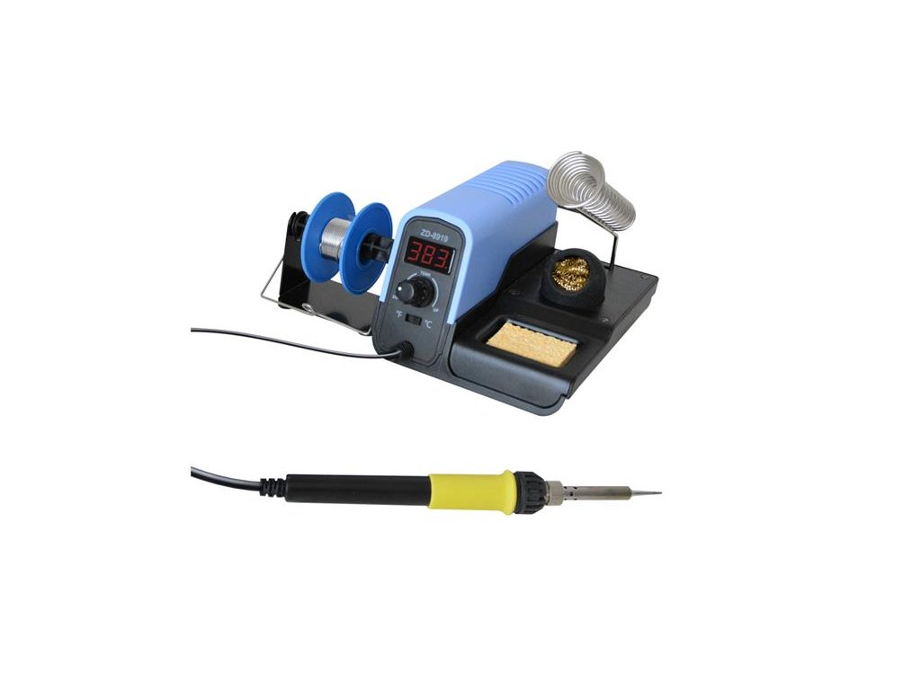 Spájkovacia stanica ZD-8919Spájkovacia stanica s riadenou teplotou - Model: ZD-8919, je vhodná pre spájkovacie práce technikov v továrňach, laboratóriách na výrobu alebo opravy elektronických zariadení. Má možnosť nastavenia teploty spájkovacieho hrotu v rozmedzí 160 °C do 480 °C. Výhodou je rýchly ohrev hrotu na 400 °C za iba cca 50 sekúnd, čo je dosiahnuté tepelným výkonom až 130 W pri rozohrievanie. Nastavená teplota sa udržuje na stálej hodnote aj pri ohrievaní rozmernejších súčiastok vplyvom spätnej väzby, kedy sa meria teplota hrotu PTC článkom a podľa teploty sa spína ohrev. Výhodná je funkcia "sleep", kedy po odložení spájkovacie rukoväte do držiaka a nečinnosti 10 min sa zníži teplota a spotreba elektriny. Spájkovacie hroty sú typu N9 s vonkajším priemerom drieku 6,4 mm a vnútorným priemerom 4,5 mm a možno ich ľahko vymeniť za nové alebo za iné s iným tvarom hrotu, je možné si objednať až päť rôznych tvarov hrotov N9-16 až N9-56, dodávaný hrot je typu N9-16. S spájkovacia stanicou je dodávaná cievka s rúrkovým cínom s priemerom 1 mm a dĺžkou 2 m, ktorá je pripevnená na boku spájkovacie stanice, takže je vždy po ruke. Na čistenie hrotu je dodávaná guľa z medeného drôtu a čistiace hubka.