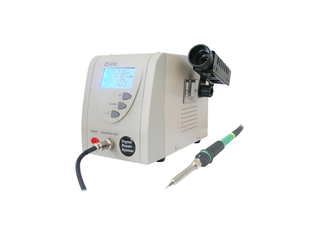 Spájkovacia stanica ZD-916Spájkovacia stanica (mikropájka) ZD-916 bola navrhnutá pre bezolovnaté spájkovanie v rozsahu teplôt 160 až 480 ° C. Prístroj je určený pre použitie v oblasti elektronického výskumu, škôl a výroby, najmä pri opravách a spájkovaní elektronických prístrojov a telekomunikačných zariadení. Môže byť použitá pre spájkovanie všetkých typov QFP, PLCC, SOP, BGA obvodov. Je riadená automaticky pomocou mikroprocesora. Dvojriadkový LCD displej zobrazuje súčasne skutočnú teplotu aj prednastavenú teplotu hrotu. Hrot s vykurovacím telieskom na napätie 24V a čidlom skutočnej teploty, má príkon 60W (pri rozohrievaní sa automaticky zvýši až na 130W). Nahriatie z izbovej teploty na 350 ° C preto trvá len cca 30sec. Digitálna elektronika a čidlo v spätnej väzbe zaisťujú takmer konštantne nastavenú teplotu, bez ohľadu na zvýšený odber tepla spájkovaním rozmernejších súčiastok a optimálneho dynamického teplotného správania. Rukoväť spájkovačky potiahnutá gumou pre ochranu pred teplom pri dlhodobej práci. Spájkovacia stanica ZD-916 so širokým výberom spájkovacích hrotov radu N4-1 až N4-4, môže byť použitá kdekoľvek v odvetví elektroniky. Vysoký výkon a ergonomický dizajn robia z tejto spájkovačky nástroj vhodný aj pre jemné spájkovacie práce.