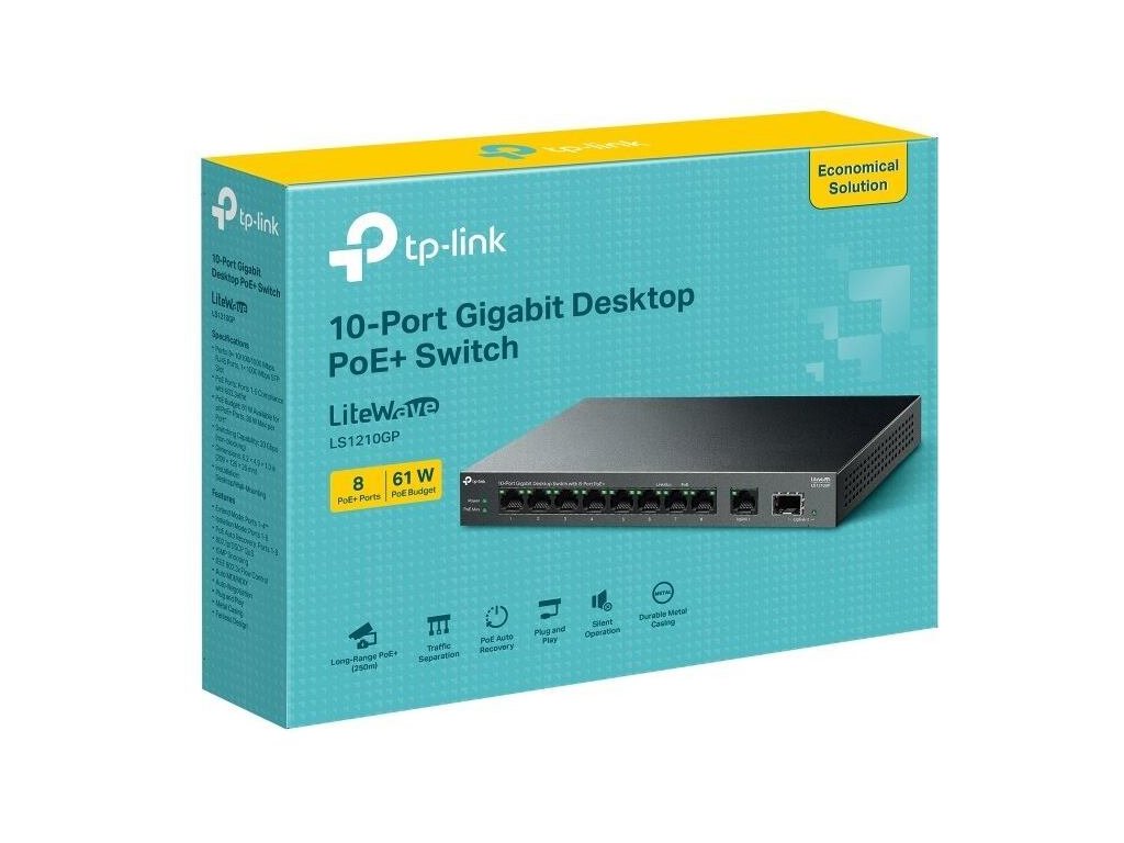 TP-Link LS1210GP predstavuje 10-portový gigabitový desktopový prepínač s 8-portovým PoE+. Tento prepínač ponúka 9x gigabitových auto-negotiation RJ45 Ethernet portov a 1x gigabitový SFP port, čo zaisťuje celkovú prepínaciu kapacitu až 20 Gbps. To umožňuje efektívnu správu sieťovej prevádzky pre rôzne aplikácie, od podnikových sietí po domáce použitie.Dodatočné parametre