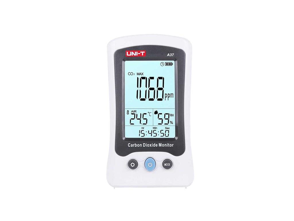 Merač kvality vzduchu UNI-T A37Na tento výrobok poskytujeme 3 roky záruku. Merač kvality vzduchu A37 dokáže monitorovať koncentráciu oxidu uhličitého v okolitom ovzduší. Oxid uhličitý CO2 je prirodzene vyskytujúce sa plyn, ktorý je produkovaný vo veľkom množstve ľudskou činnosťou, a je jedným z niekoľkých skleníkových plynov v našej atmosfére. CO2 sa vo vzduchu vyskytuje bežne v objemovej koncentrácii len 0,0407% = 407ppm. Ak dýchate vyššej koncentráciu CO2, môžete byť vystavení riziku intoxikácie oxidom uhličitým. Medzi príznaky intoxikácie oxidu uhličitého patrí bolesť hlavy, nepravidelný srdcový rytmus, nevoľnosť, bezvedomie alebo dokonca smrť.