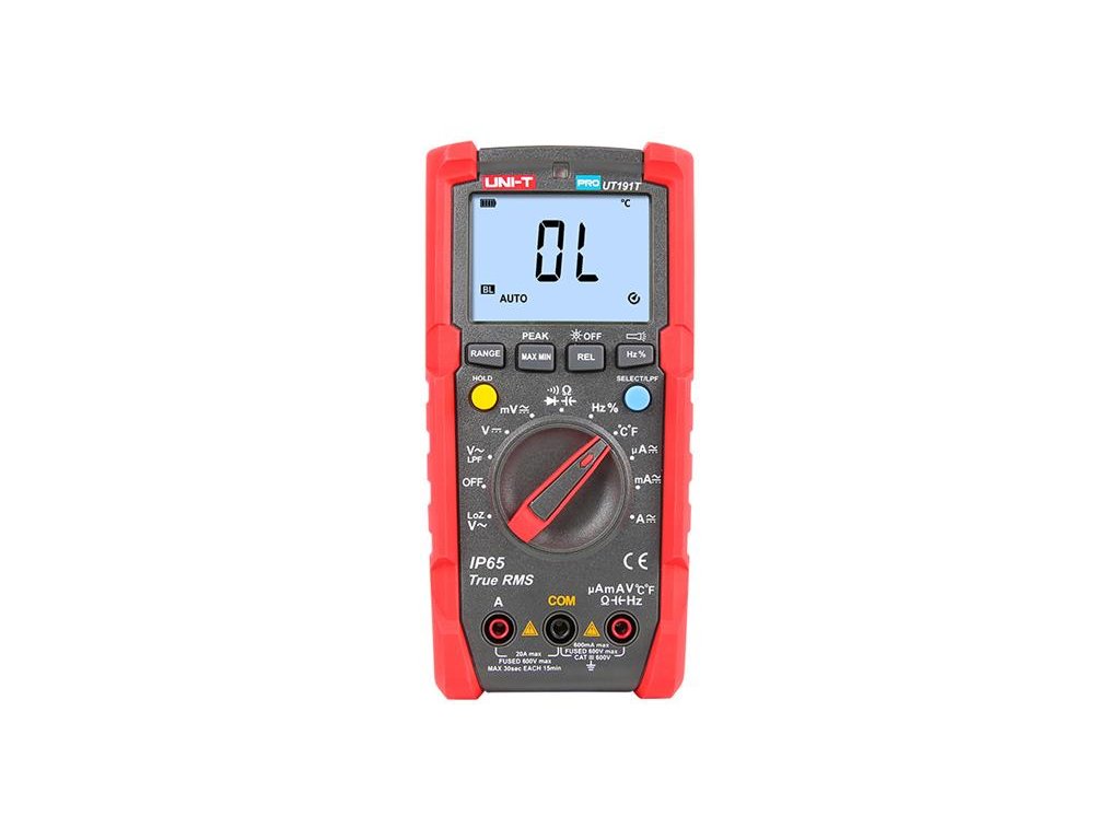 Profesionálny multimeter radu UT191 určený pre priemyselných užívateľov (elektrikára, opravára, údržbára a servisných technikov). Je vhodný pre každodenné použitie v aj tých najdrsnejších podmienkach. Prístroj vydrží pád zo 2m a vďaka stupňu krytia IP65 poskytuje vynikajúcu ochranu voči vode a prachu. Nová funkcia pamäti si zachováva najnovšie nastavenie režimu pri nasledujúcom zapnutí a zvyšuje efektivitu pre užívateľov. UT191T podporuje presné meranie teploty.