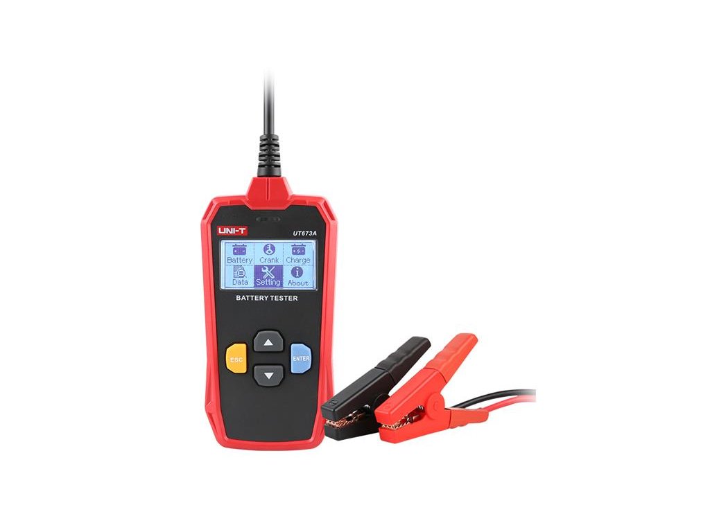 Prístroj UT673A je prenosný tester automobilových olovených akumulátorov, ktorý umožňuje analyzovať stav akumulátorov s kapacitami v rozsahu 30 až 200Ah bez ich demontáže. Je vybavený špičkovou technológiou, ktorá umožňuje merať napätie akumulátora, nabíjacie prúdy systému auta, vnútorný odpor akumulátora, štartovacie prúdy, zostávajúcu kapacitu akumulátora v percentách a zostávajúcu životnosť akumulátora v percentách. Pred začatím testovania je potrebné zvoliť typ batérie – bežná olovená batéria, plochá batéria AGM, špirálová batéria AGM, gélová batéria, batéria EFB a štandard batérie – CCA, BCI, CA, MCA, JIS, DIN, IEC, EN, SAE, Ah. Pokiaľ štandard nie je možné zistiť, zvolí sa štandard CCA, napr. 60Ah, prúd studeného štartu 500A a testuje sa.