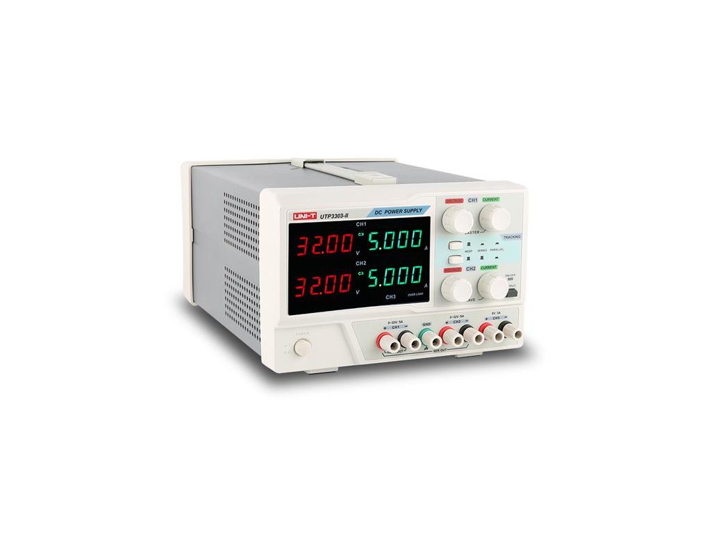 Na tento výrobok poskytujeme 3 roky záruku. Laboratórne zdroje UTP3303-ll sú značkové zdroje s tromi nezávislými kanálmi od výrobcu UNI-T. Zdroje obsahujú klasický lineárny transformátor a v kanáloch CH1, CH2 umožňujú prácu v režime nastavenia konštantného výstupného napätia v rozmedzí 0 až 32V alebo v režime konštantného výstupného prúdu 0 až 3A (alebo 0 až 5A pri type UTP3305-II). Kanál CH3 poskytuje na výstupe konštantné napätie 5V a má ochranu proti preťaženiu pri dosiahnutí odberu prúdu 3A. Kanály CH1 a CH2 môžu pracovať nezávisle na sebe, alebo je možné ich interne prepojiť sériovo alebo paralelne, potom dodávajú napätie 0 až 64V/0 až 3A (5A) alebo 0 až 32V/6A (10A). Laboratórne zdroje majú štyri displeje LED, ktoré zobrazujú napätie a prúdy súčasne, s presnosťou na 4 miesta v každom z kanálov CH1 a CH2. Zdroj obsahuje teplotne riadený ventilátor, dlhodobé teplotné preťaženie transformátora laboratótneho zdroja stráži čidlo, ktoré pri dosiahnutí medznej hodnoty zdroj vypne a po ochladení opäť zapne. Prístroj má certifikáciu CE.