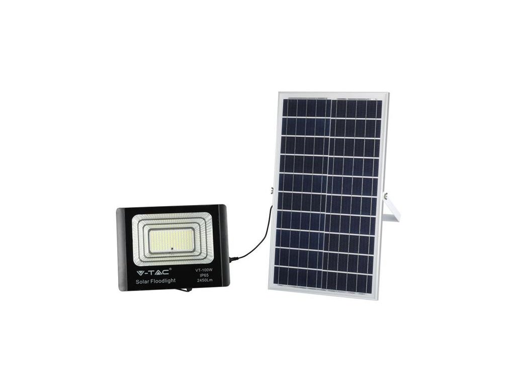 LED solárny reflektor V-TAC VT-100W s výkonom 35W vybavený solárnym panelom, internou lítiovou batériou a infračerveným diaľkovým ovládaním pre ovládanie funkcií: spínač ON/OFF, funkcia časovača a stmievač intenzita svetla. Vyrobené z vysoko pevného čierneho hliníka s priehľadným sklom a vnútorným reflektorom, ktorý umožňuje veľmi široký uhol osvetlenia asi 120°.