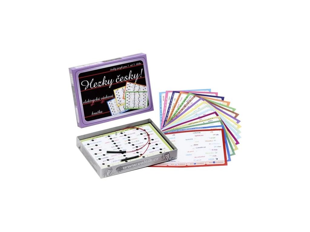 Hra vzdelávacia Pekne po českyElektrická výuková hračka k osvojení základních pravidel českého pravopisu vyučovaných v 1. až 3. třídě základní školy. Na 16-ti listech je natištěno 640 pečlivě vybraných slov, do kterých děti doplňují chybějící písmenka. Ve spodní části každého listu jsou uvedeny možnosti odpovědí. Jednotlivé listy s úlohami jsou v souladu s učebnicemi pro 1. až 3. třídu základní školy.