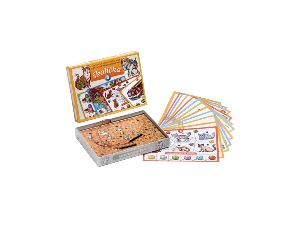 Hra vzdelávacia Školička 2Spoločenská hra Školička 2 je určená pre predškolákov od 4 rokov veku. Elektrická kombinačná hra obsahuje 16 listov s mnohými obrázkami, každý list je zameraný na určitú oblasť detského sveta, ako sú napríklad zvieratká, autíčka alebo obľúbené postavy z rozprávok. Zmyslom hry je nájsť medzi obrázkami súvislosti. Pokiaľ deti na otázku odpovie správne, rozsvieti sa zelené svetielko na elektronickom skúšacom obvode.