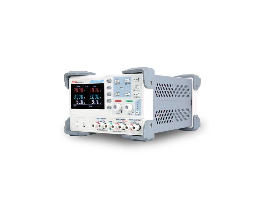 Programovateľný jednosmerný napájací zdroj UDP3305C je cenovo výhodný, značkový laboratórny napájací zdroj so štyrmi nezávislými kanálmi od výrobcu UNI-T. Zdroj obsahuje klasický lineárny transformátor av kanáloch CH1, CH2 umožňuje prácu v režime nastavenia konštantného výstupného napätia (CV) v rozmedzí 0 až 30V alebo v režime konštantného výstupného prúdu (CC) 0 až 5A. Kanál CH3 poskytuje na výstupe konštantné napätie s možnosťou zvolenia hladiny 1,8V; 2,5V; 3,3V alebo 5,0V a má ochranu proti preťaženiu pri dosiahnutí odberu prúdu 3,2A. Okrem toho je na prednom paneli konektor USB, ktorý slúži ako kanál CH4 a je ním možné nabíjať napr. mobilný telefón napätím 5V/2A.